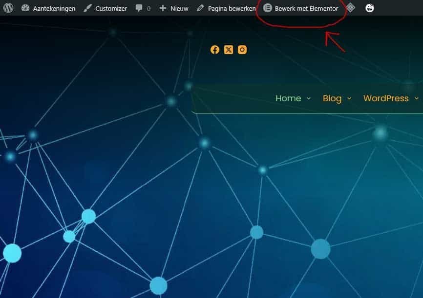 Ga via het menu naar de desbetrefende pagina. Bovenaan de editor zie je de knop Bewerken met Elementor. Klik daarop om naar de Elementor-editor te gaan.