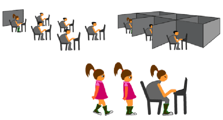 Moderne sprookjesversie van Alice in Wonderland: Alice zit vast in een kantoorcubicle en droomt van vrijheid buiten het systeem.
