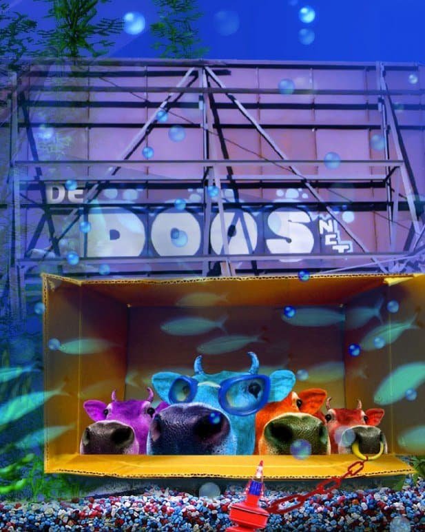 Geanimeerde uitnodiging voor ons Stierenfeest: vier stieren (vriendinnen met zelfde sterrebeeld) op lokatie: De Doos. Thema: Onderwaterwereld.